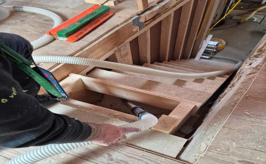 Inutile de tout casser, Isolovert s'adapte aux situations les plus contraignantes. Dans le cadre d'un chantier de rénovation, par exemple, l'isolant est pulsé entre le mur et la cloison par de petites ouvertures que nous refermons ensuite. De cette façon, l'isolant se loge uniformément dans les moindres recoins.